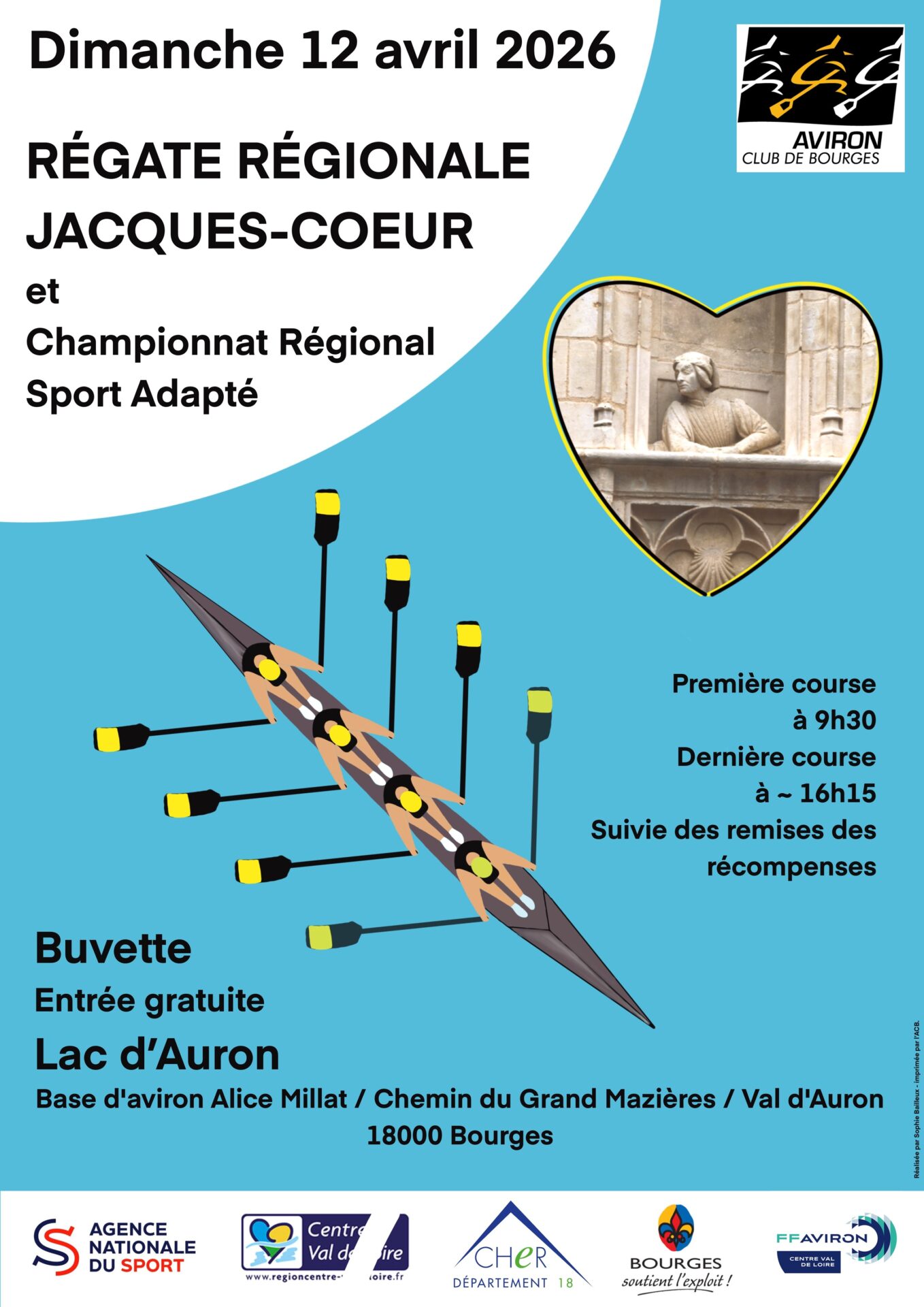 Le dimanche 12 avril 2026, l’Aviron Club de Bourges organise sur le lac du Val d’Auron à Bourges, la régate régionale Jacques-Cœur ainsi que le championnat régional du sport adapté avec le soutien de la ligue du Centre-Val de Loire d’aviron. Toutes les catégories sont représentées. Environ 100 participants sont attendus sur le bassin d’aviron pour cette journée de compétition. Le programme prévisionnel est disponible dans la réglementation sportive de la Ligue du Centre Val de Loire d’aviron : Ligue du Centre – Val de Loire d’Aviron