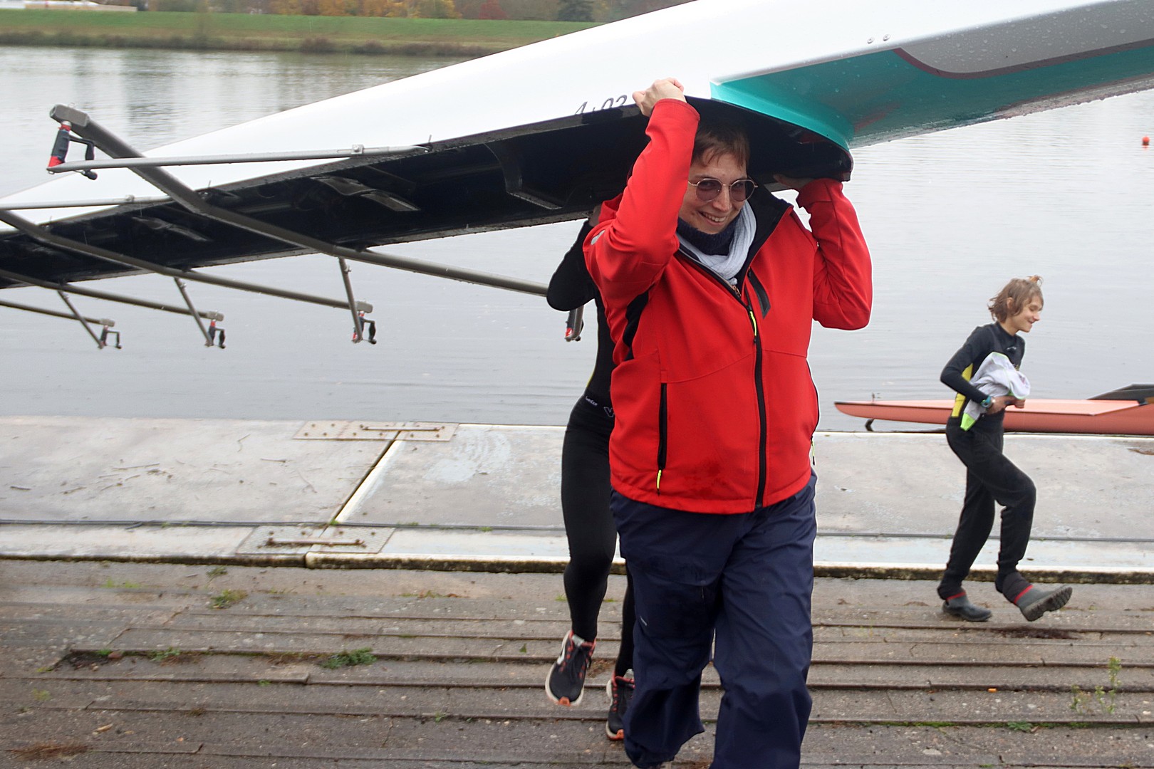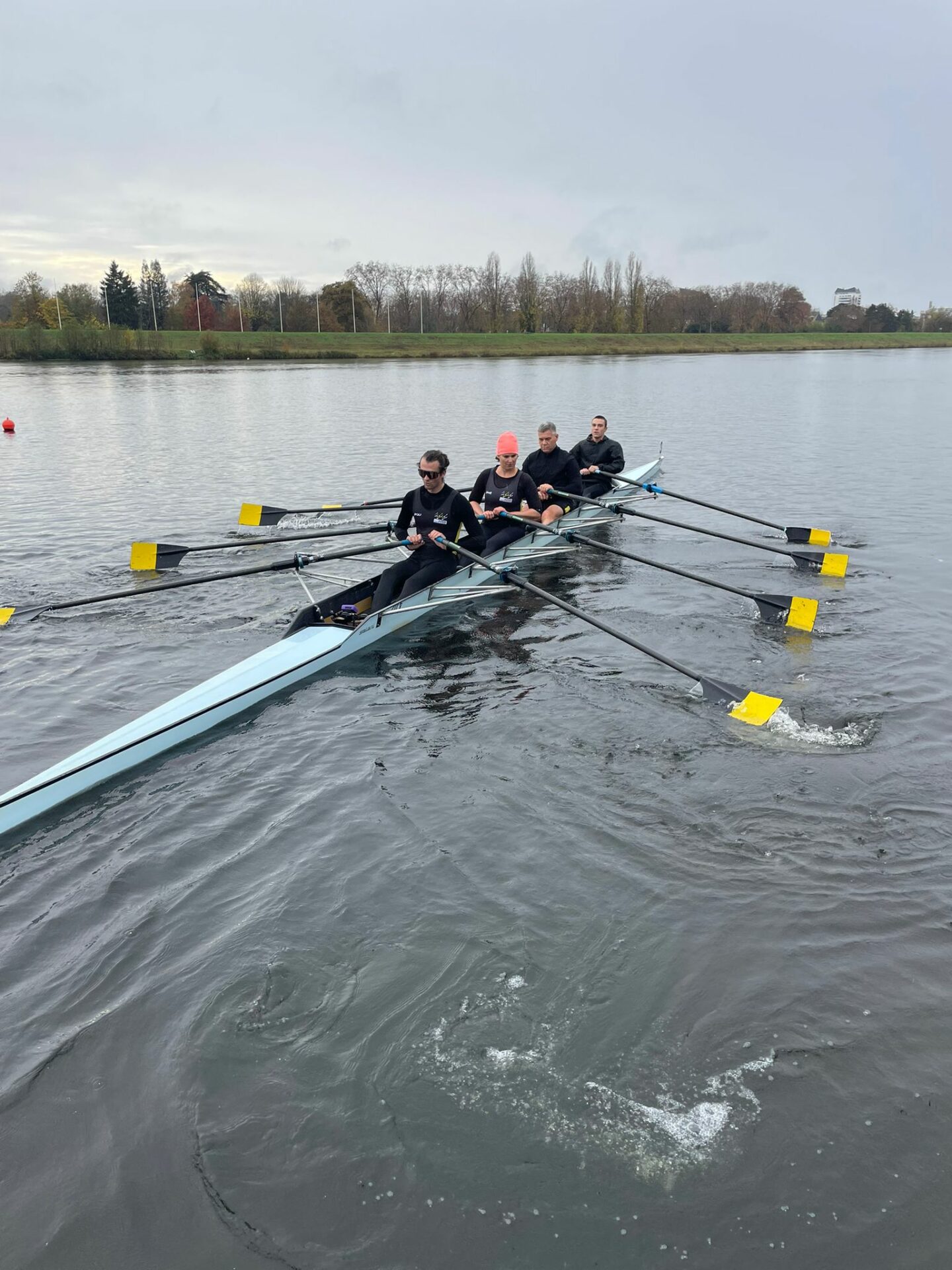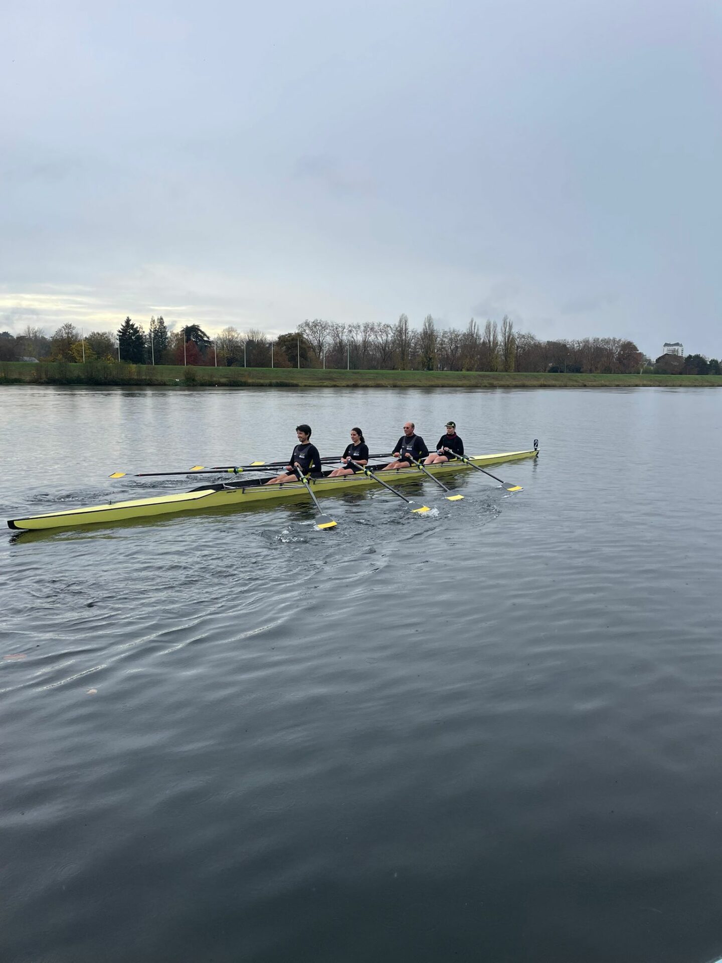 Malvina raconte la course en 4 Master Mixte de couple de l’après-midi : « avec Emma, Lionel et Sam nous avons pu tester notre nouvelle équipe en 4 de couple. Les entrainements ont débuté en novembre seulement mais nous ne pouvions pas manquer l’Animation Automnale ! Pour nous, Tours était une étape préparatoire en vue de Mâcon en février 2026. Notre bateau a été réglé par Yves la semaine précédente (Merci Yves parce que c’est tellement agréable d’être bien réglés !), nous étions curieux de l’expérimenter en course pour la première fois. Au final, c’était une belle sortie, avec une cadence pas du tout prévue… 😅😂 Cadence portée par notre nage qui avait décidé de ne pas laisser Pierre-le-coach gagner. Pour conclure, plus que notre place au classement, c’est notre temps sur ce 1000m qui fait socle pour nos entrainements à venir »